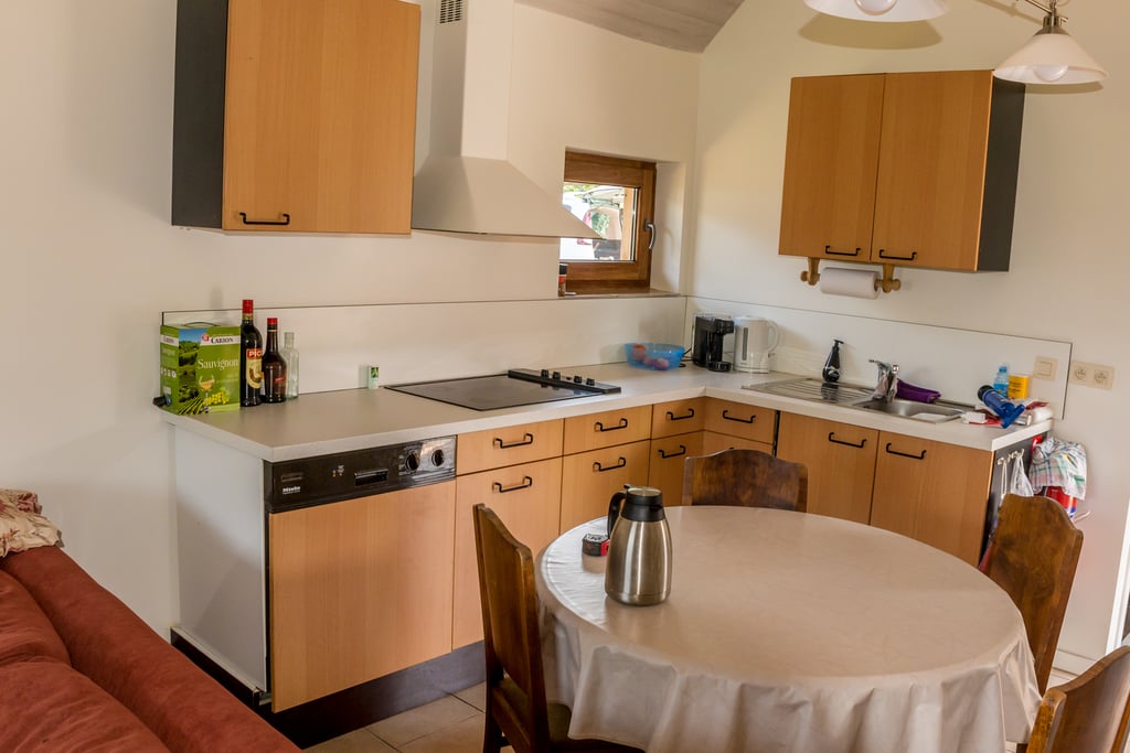 - boven de slaapkamer is er een (zeer) lage mezzanine waar 2 personen kunnen slapen (eerder voor kinderen bestemd) matras 160x200 cm ; donsdekens 2 x 90x200 cm
