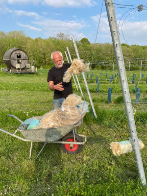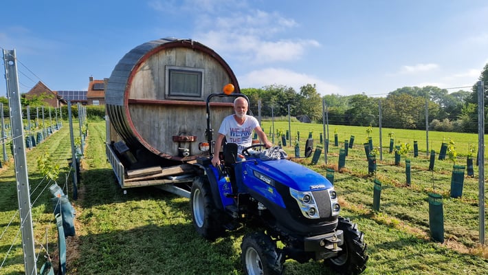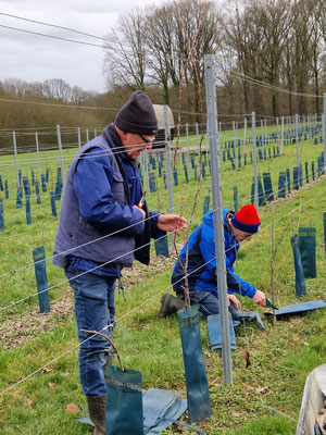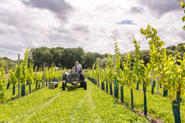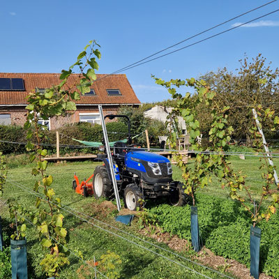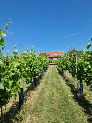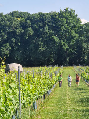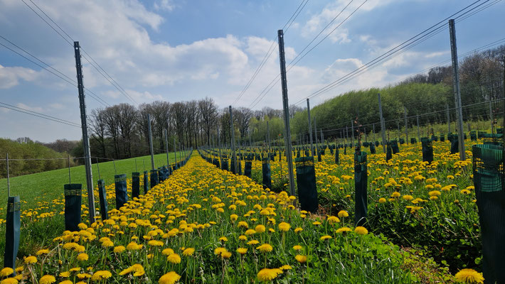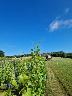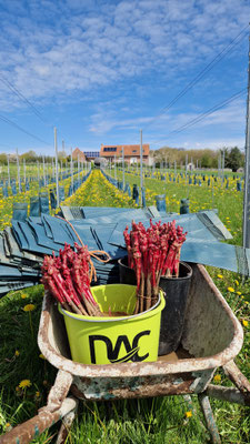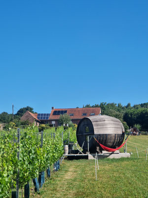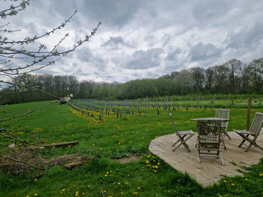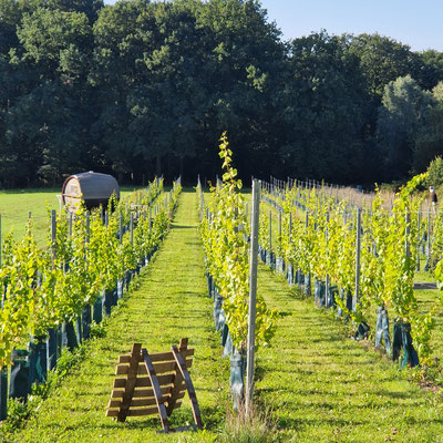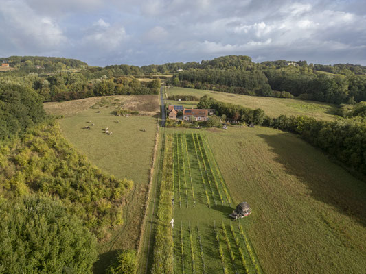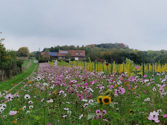 Ons wijnveldje met een 1000-tal Chardonnay stokken ligt pal voor onze vakantiewoning, op de zuidelijke flank van de Zwarte- en Rodeberg en naast de kronkelende Douve : de "schreve" , de grens met Frankrijk.